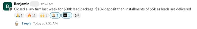 Closed a law firm last week for a $30k lead package, $10k deposit then installments of $5k as leads are delivered